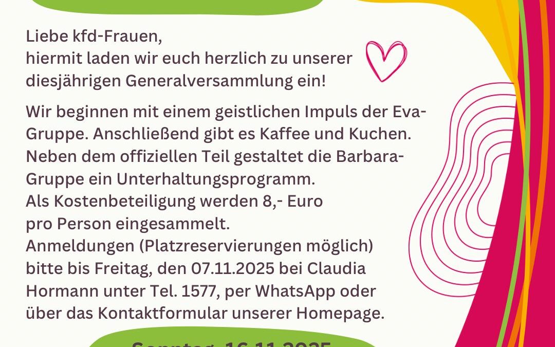 Alle kfd-Frauen sind herzlich eingeladen zu unserer Generalversammlung/Elisabethfeier in der Gaststätte Giesbrecht. Die Veranstaltung beginnt um 14:30 Uhr mit einem geistlichen Impuls. Anschließend gibt es Kaffee und Kuchen. Neben dem offiziellen Teil von Kassen- und Jahresbericht wird ein interessantes Unterhaltungsprogramm geboten, gestaltet von der Barbara-Gruppe. Platzreservierungen sind bei der Anmeldung möglich. Anmeldungen nehmen wir bis einschließlich Freitag, den 07.11. entgegen.